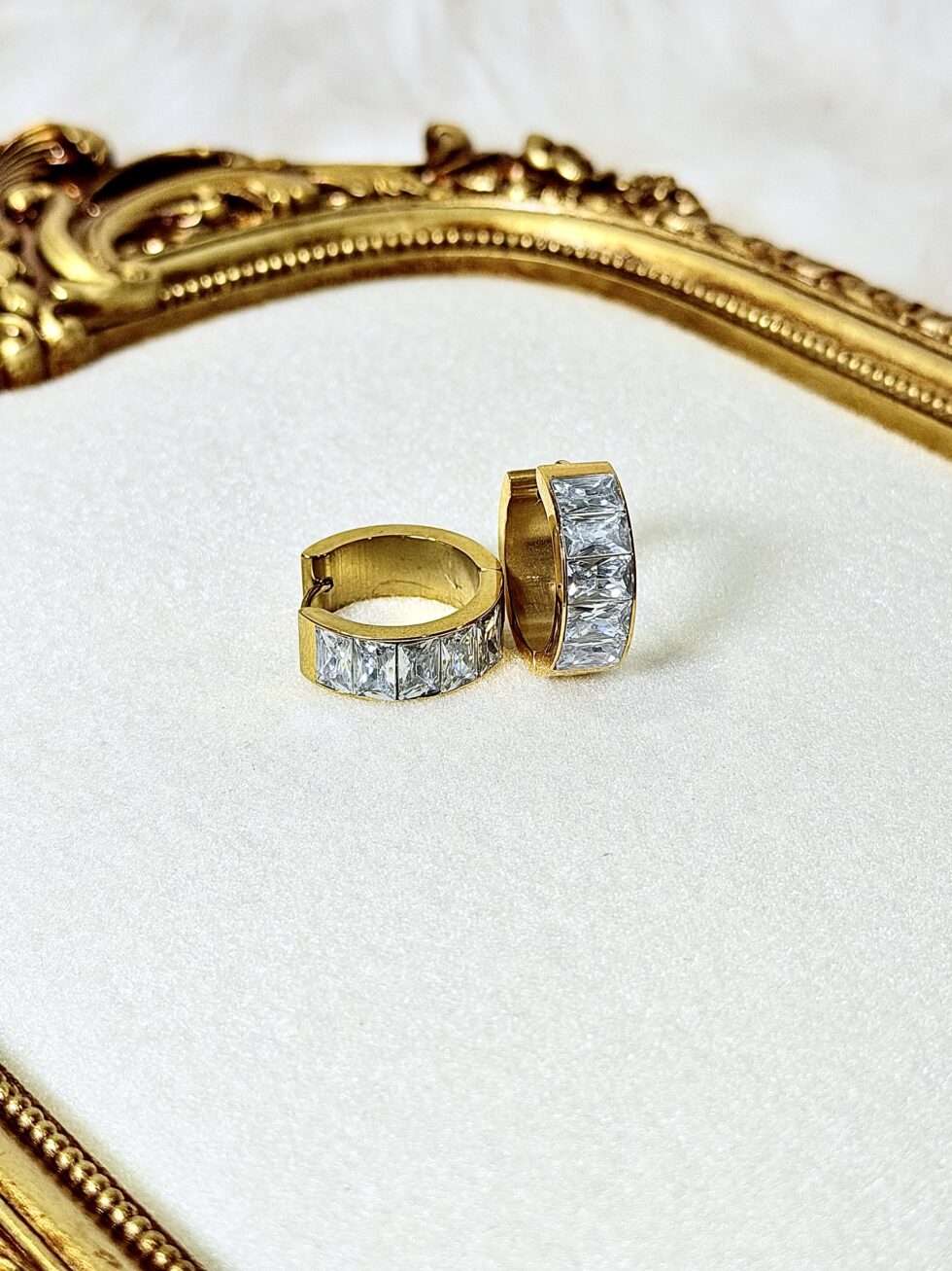 Timeless 18K gold-plated hoops, adorned with sparkling silver zirconia studs. Crafted in anti-tarnish stainless steel for lasting elegance and everyday shine.
